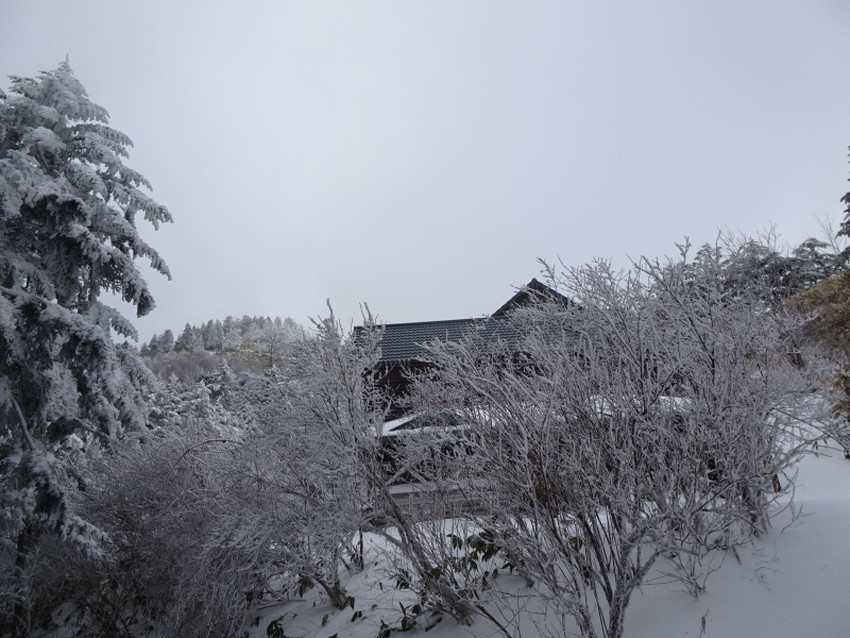- 分岐からは少し雪の量が増え若干足が埋まるがそのまま進む、でも前に見た「千本立」辺りの樹氷の姿は見れなかった、この後も過去の記憶にある大きな巻き道を2箇所越えて気が付けば「萬岳荘」が見えた。