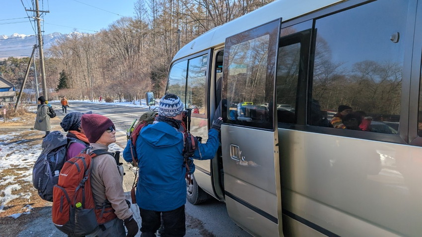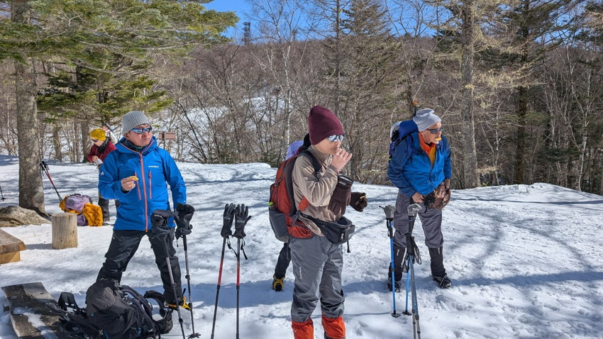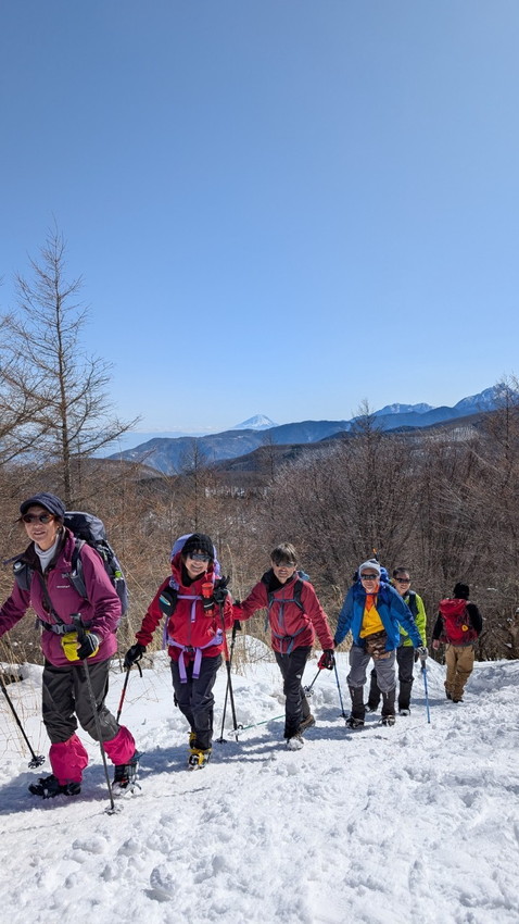 - 沢入登山口へ行く途中、路面が凍っていた為、ゴンドラで登る事になりました。天気に恵まれてアイゼンで入笠山を登ると、富士山・八ヶ岳連峰が目に飛び込んできました!そんな幸せな景色を見ながら昼食。みなさんのお話しも楽しくて、ずっと笑っていました。下山も緩やかで楽しい山行でした。