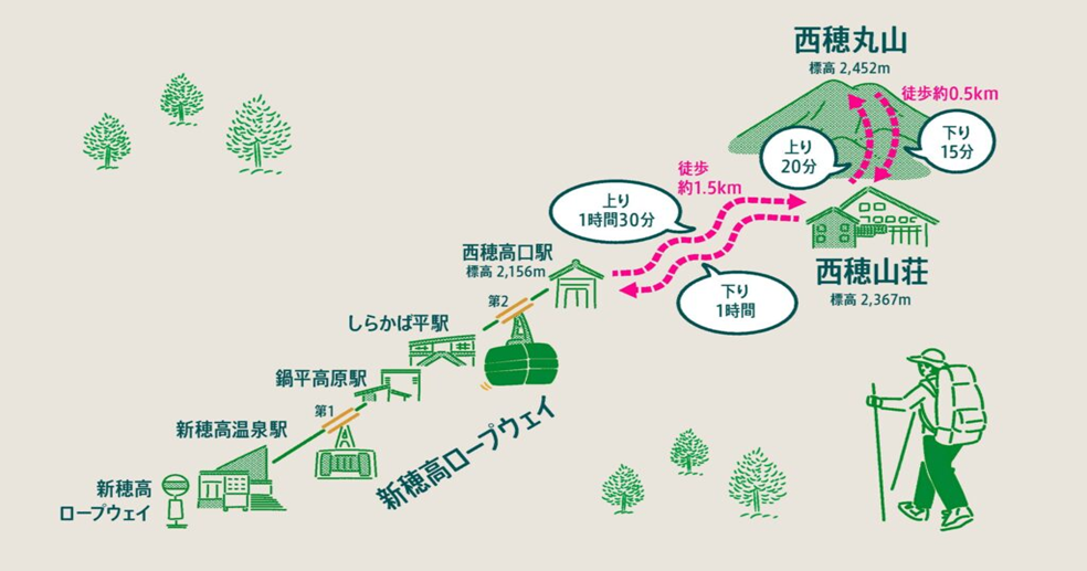 | 新穂高ロープウェー駅9:30→西穂高駅10:00→休憩10:30→西穂山荘11:40→休憩 13:00→西穂丸山13:20→西穂山荘13:30→西穂高駅14:30 |
