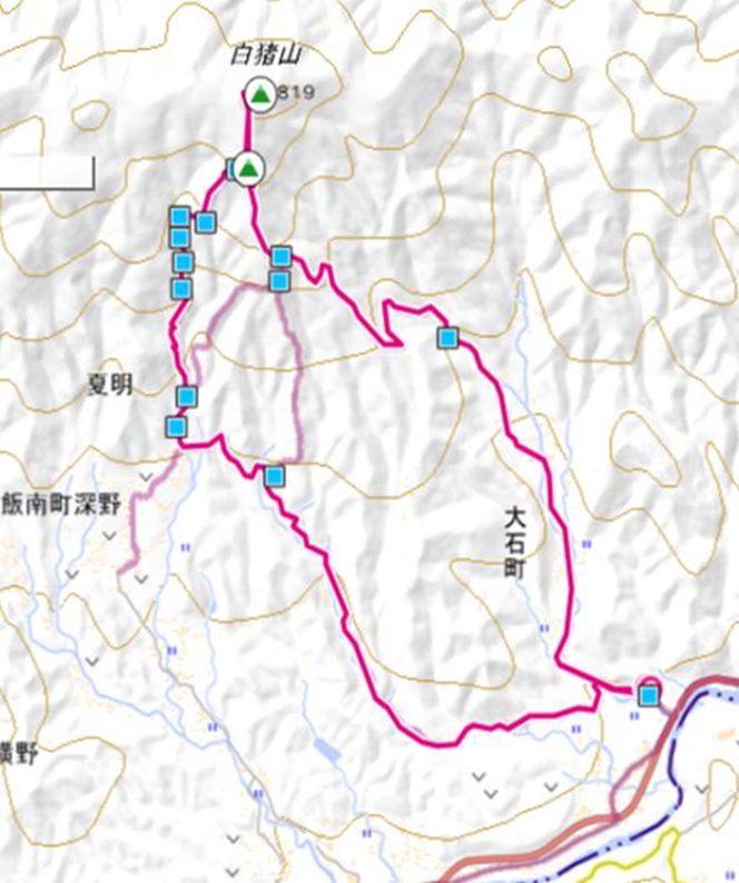 安八役場5:00=白猪山登山口駐車場7:22→都登山口7:56→ニノ峰9:00→白猪山10:00→不動滝10:30→夏明登山口11:22→白猪p12:19 12:30とりいち本店にて昼食13:45=安八役場16:00 ※とりいち本店-松坂市伊勢寺町2640-1