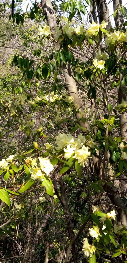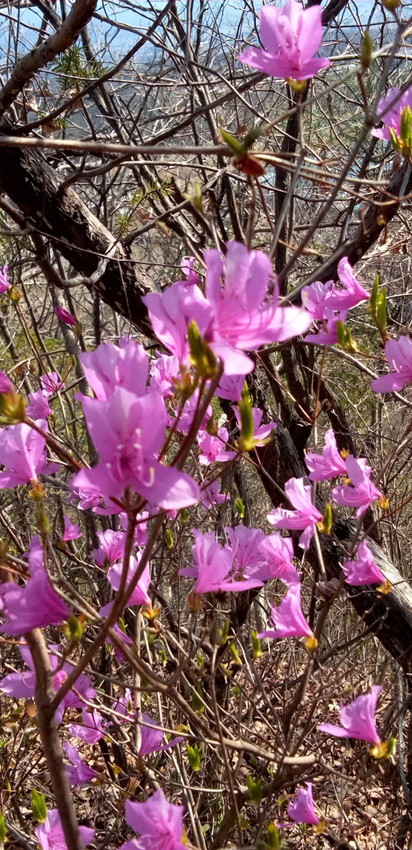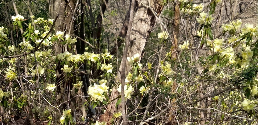 - 肌寒い朝だったけど、次第に気温は上昇。高齢のの2名が健脚の2名に待ってもらいながら登ったり降りたりを繰り返す。やがて岩坂山を超えて15分ほど進むとミツバツツジがアーチを作って迎えてくれる。気持ちがいい。そして程なく右に折れたと思ったらなんと黄色いヒカゲツツジの群生。感激屋の私はまあ!とかなんとか大きな声をあげてしまった。ヒカゲツツジを初めてしかも沢山見たのだから。そして急登を一つクリアして緩やかな登りを終えた向山見晴台が今日の目的地。ゆっくりランチを楽しむ。帰りは同じ道なので。ヒカゲツツジまでは。も一度見るのを楽しみに進めたのだけれど、そこからの単調な上り下りはある意味試練で、これがこのコースの魅力の一つと言えると思う。健脚の二人にはとうに置いてきぼりにされ、高齢の二人はそれでもおしゃべりは止めずにマイぺーすで進む。コースも終わりに近づいて 大岩見晴台で一念発起。慧音少年について歩くと決めあしを速める。少年は楽そうに歩いているのに、私はトレランしているくらいの気分で付いて行く。しかし最後の階段で見事に離されてしまった。私がどんくさいのだ。兎も角13時台に下山出来たことは、自分を誉めてあげよう。