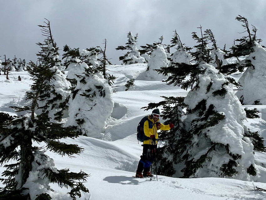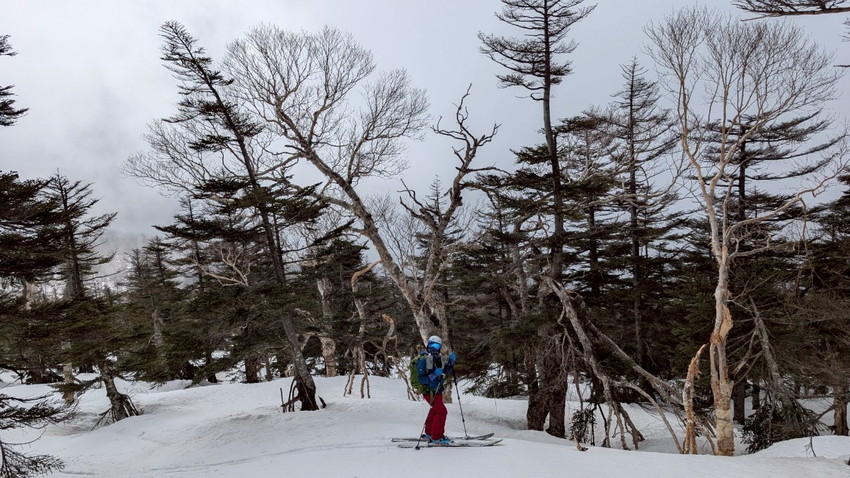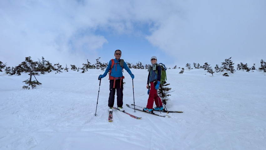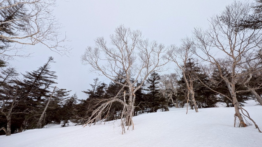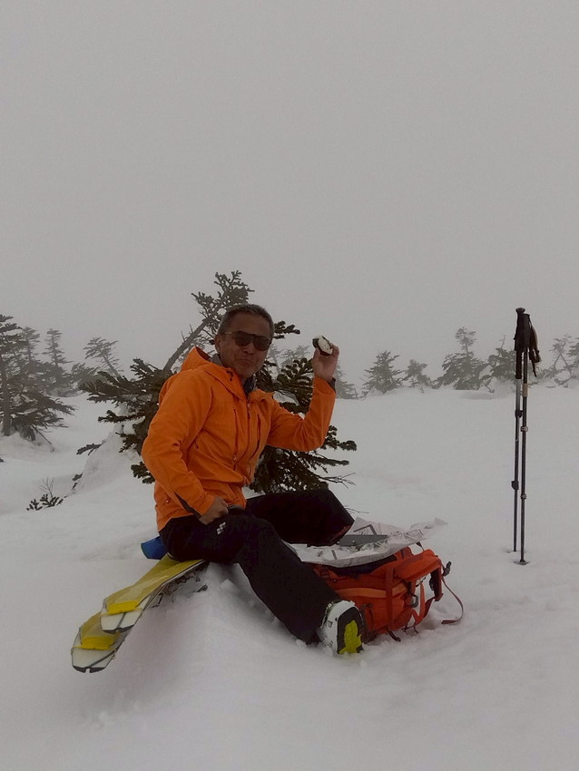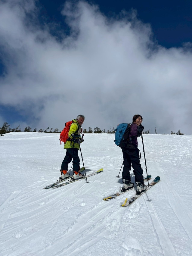 - 雪質は水分が多く滑りやすい(スピードが出てコントロールするのが難しい)。しかも私のスキーの金具が調子悪く(固定できるがすぐに踵が外れる)、プラスドライバーで調整するのに時間がかかり、他のメンバーに先に行ってもらう。結果、私たち夫婦は中大巓までとし、他のメンバーは西吾妻山まで行ってもらう。最初はガスっていたが、上部に行くにつれて晴れてきたがまたガスったりと、山の天気は目まぐるしく変わる。