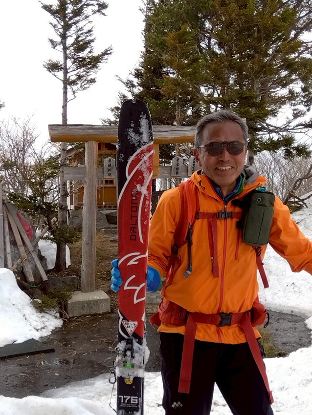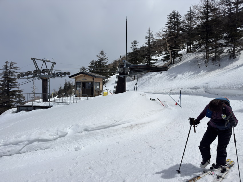 - ロープウェイを降りて板を履きリフト乗り場に滑り始めてすぐに転けてしまった。昨日の月山ではザラメの気持ち良い雪質では1度も転ばず絶好調だったのだけど、雪が高温により水っぽく滑り過ぎるようだ。リフト降り場でもまた転けてしまい、悪い予感がしたら、今度は旦那のビンディングの調子が悪くなり、他のみんなには先に行ってもらう。リフト乗り場の係員の方にドライバーを借りビンディングがなおったので再びリフトに乗ったらみんなが心配して待っていてくれて感激した。それでも私たち2人は中大巓までとし、みんなと別行動となった。賢明な判断で樹林帯での最初の滑りで何回も転倒。ボーゲンを駆使しながらホワイトアウトの中ゲレンデにたどり着いて一安心し、ゲレンデでも気の抜けない雪をなんとか無事ロープウェイに降りました。