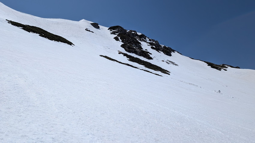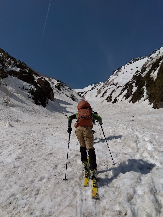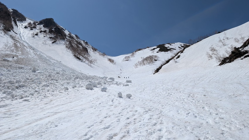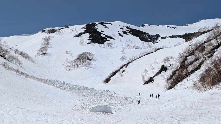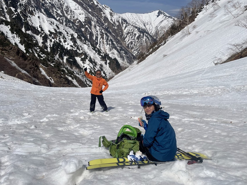 - お楽しみの滑走は、登行で疲れ果てた後なのでヘロヘロ状態。例年よりデブリが少なめなのと、雪質はややシャーベット状でツボ足の跡もあまり気にせず滑走できたのがせめてもの救いでした。