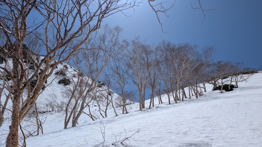 - 急斜面になると後ろに滑ってしまうことが多くなり、体力を消耗してしまいました。シールでの急登ハイクアップにまだまだ課題があるようです。(byカズちゃん)