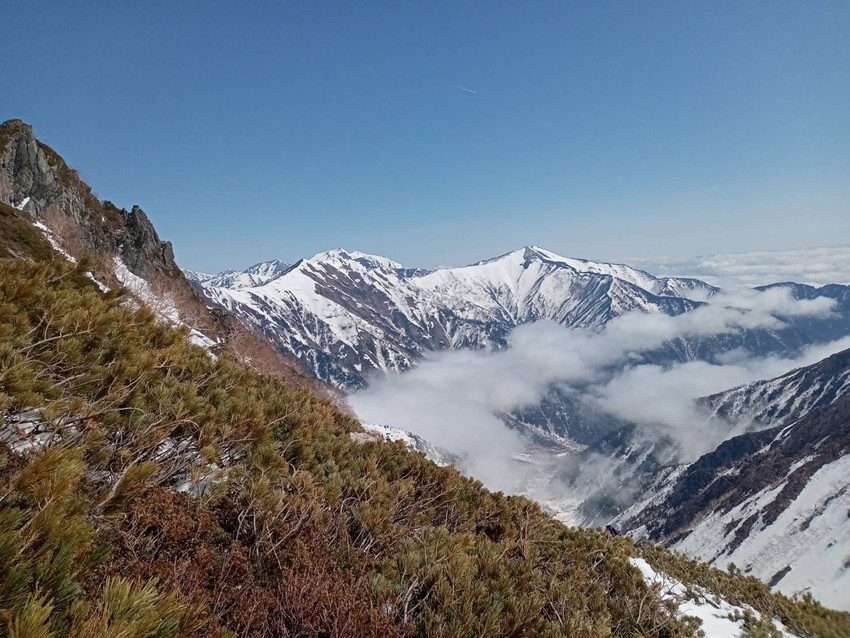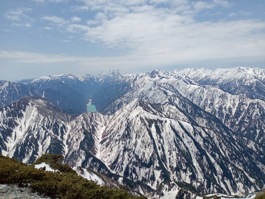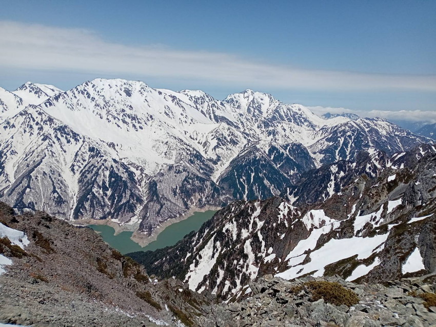 - 翌朝5:00スタート、快晴☀針ノ木雪渓30分程歩くと斜度が増してくる!見上げると多くの登山者がアリの様に見える、息も絶え絶えにスバリとのコルへ立つ、軽く食事を済ませ再スタート、ここから山頂迄、岩とのミックス足元不安定の上強い風が吹き付け難儀!しかし、本日の北アルプスは快晴、疲れも吹っ飛ぶ!目前に立山、右に剱岳、足元は黒部峡谷!遠く槍も見える、名残惜しいが何時までも楽しんで居られない!帰路は針ノ木峠へ、山頂から雪のたっぷり付いた急下降!バックスッテプ降りる!緊張が解けた所に雷鳥の番が現れる❣針ノ木小屋は半分雪に埋まり営業前!峠からグッツァンさんは尻セード❣ワタシは濡れるが嫌でジミにコツコツと長い雪渓を下って行きましたとさッ❣