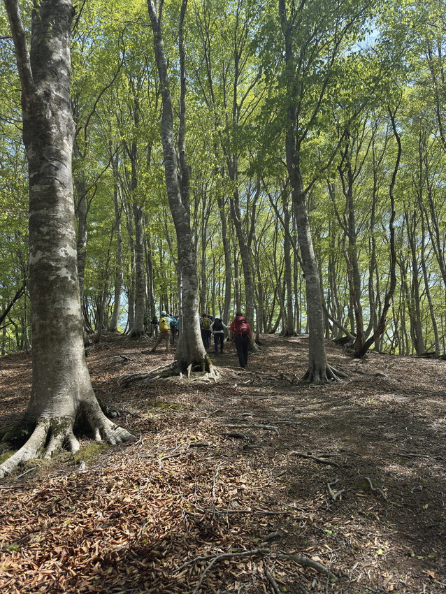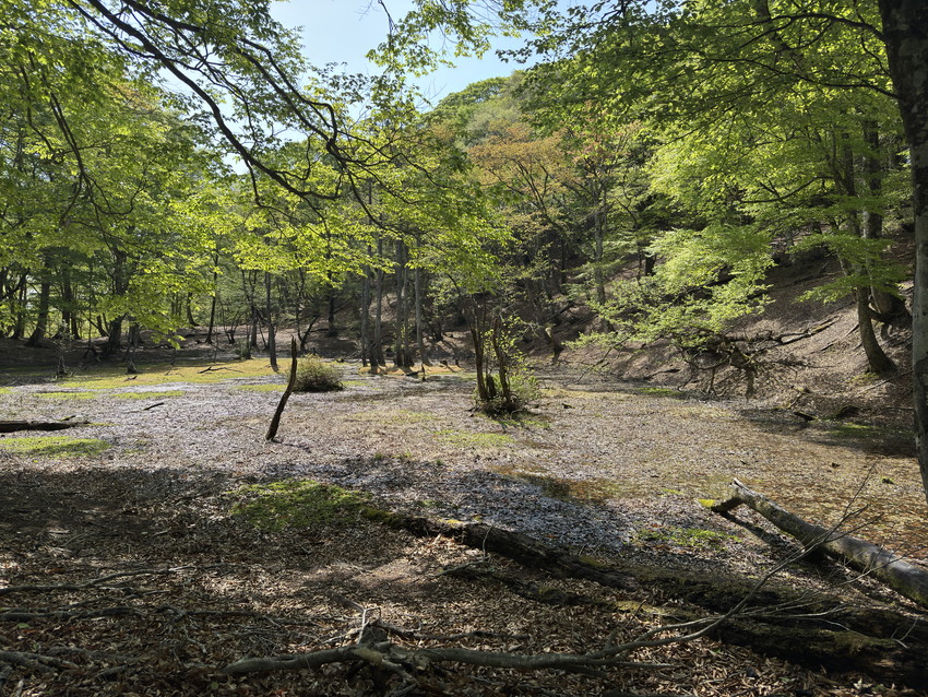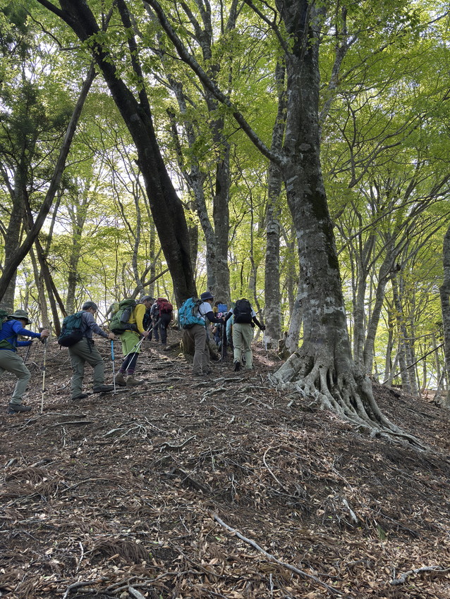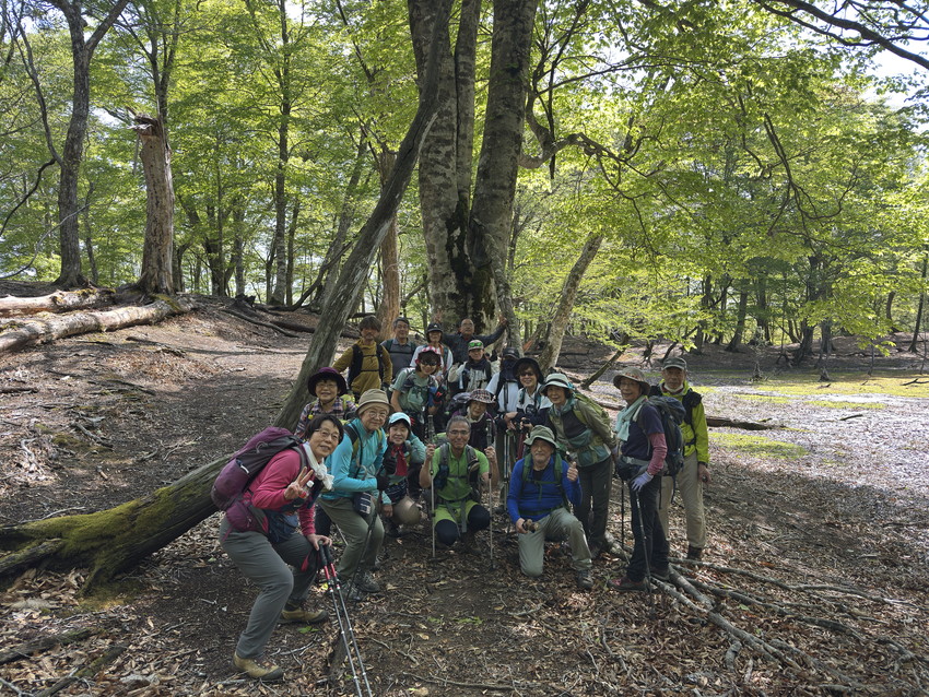 - 美しいブナ林、静かにたたずむ駒ヶ池など、美しい自然が残る山としてとても魅力のある山でした。その中で印象に残った出来事が2つありました。登りで渡渉が4カ所ほどありました。見た目より深さがあり、苔で滑りそうだったり、結構大変でした。そこで前で渡渉しているNさんをフォローしようとしたMさんがスッテンと後ろに転んでずぶ濡れ状態に。身を呈して仲間フォローしようとした姿に感動しました。晴れていたので服が早く乾いたのでよかったです。
