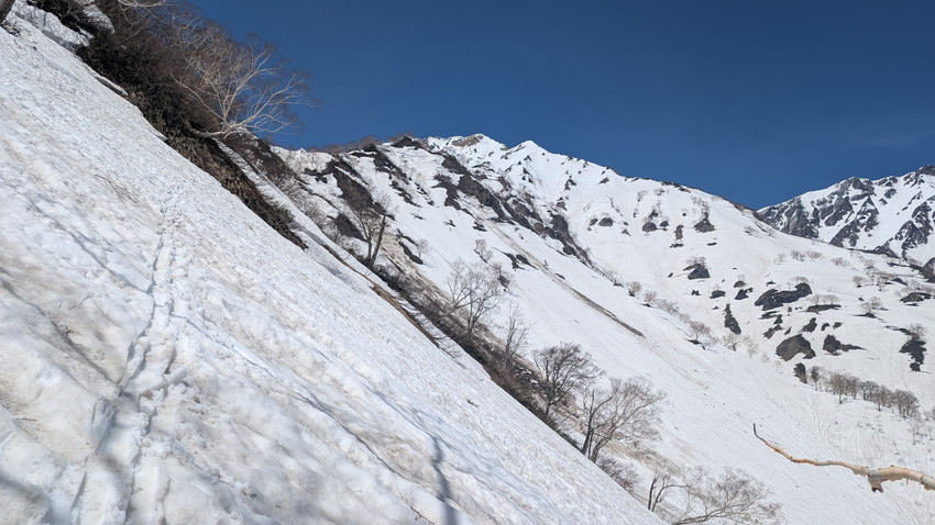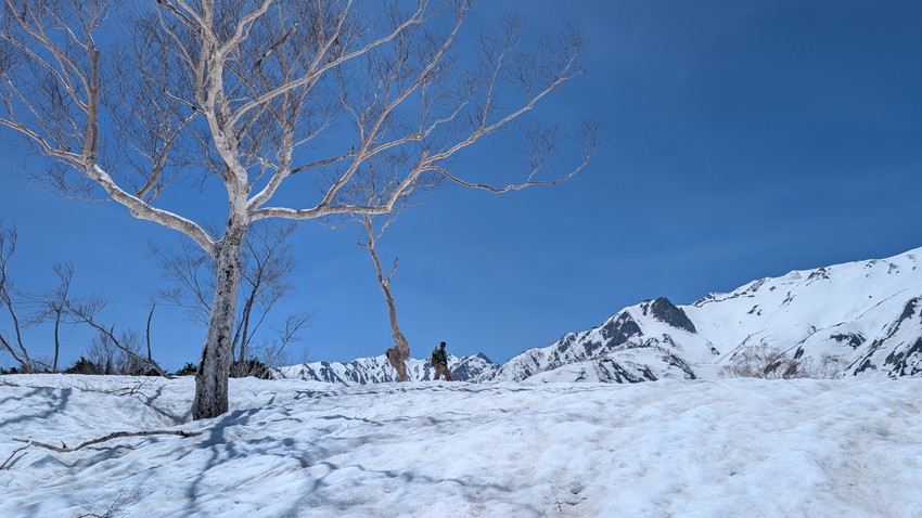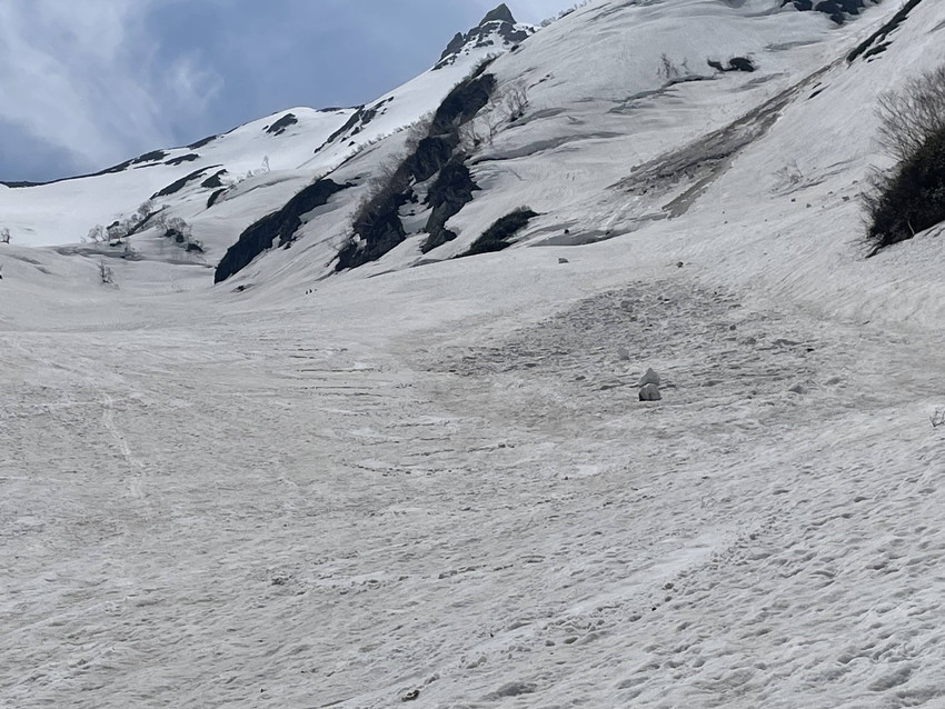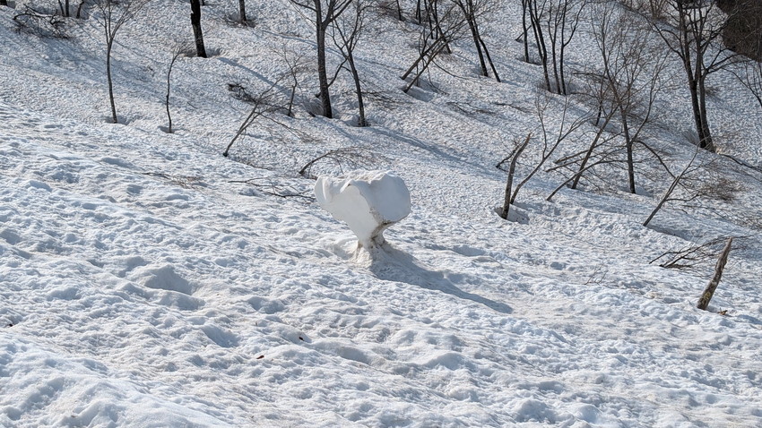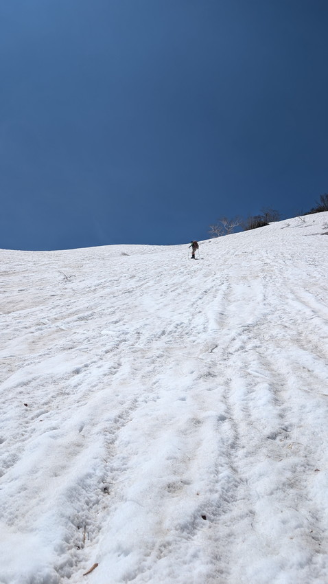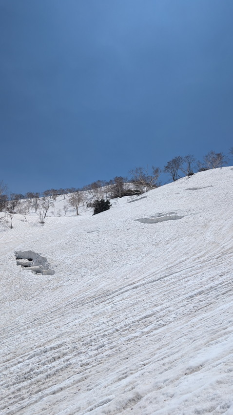 ・縦溝が多くて心配でしたが、雪質がシャーベット状で簡単に潰れてくれるし、広い雪原なので大きな縦溝は回避して快適に滑ることができました。急坂ではクラックがあったので、その点には注意していました。