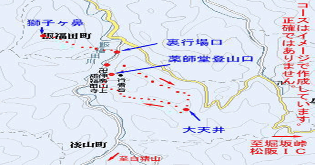 | 西濃総合庁舎6:00→伊勢山上行場飯福田寺入口8;30→行者岩9:00→大天井9;30→伊勢山上行場飯福田寺入口12;;40→休憩13:00→食事13:30→西濃総合庁16:00 |
