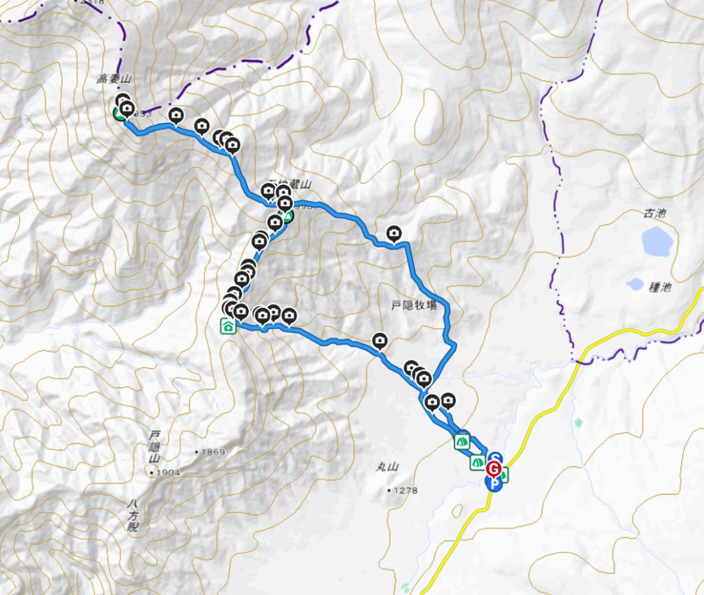 | 戸隠キャンプ場前駐車場6:50~一不動避難小屋9:20~五地蔵山10:50~高妻山13:00(休息)13:40~五地蔵山15:15~戸隠牧場管理事務所17:36~戸隠キャンプ場前駐車場17:50 |