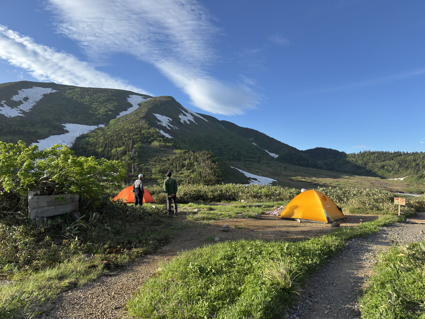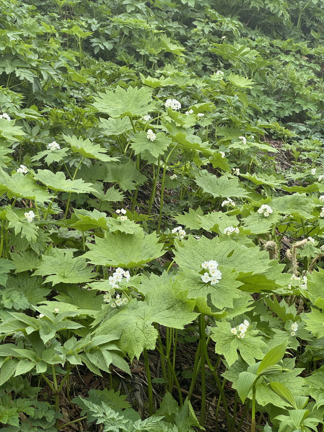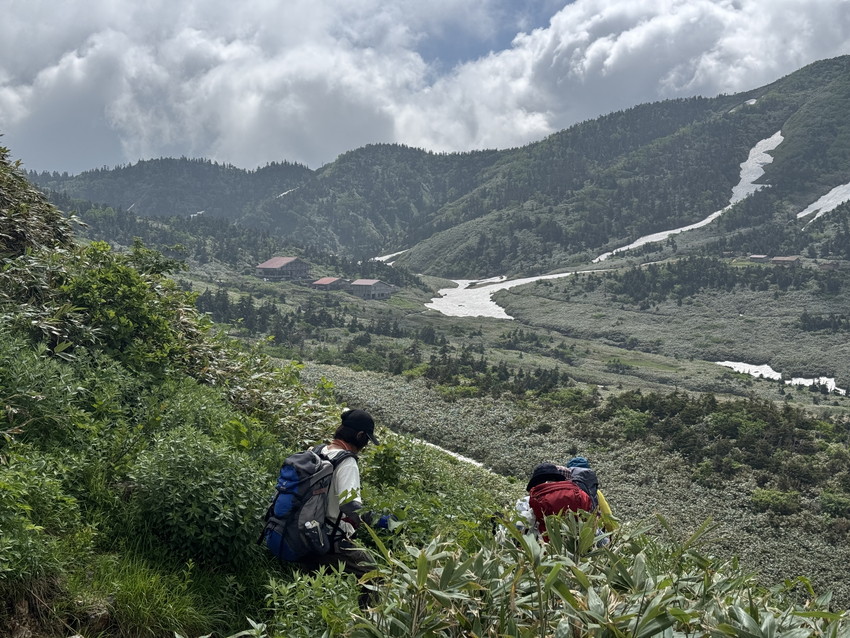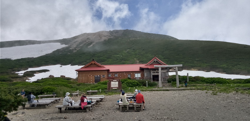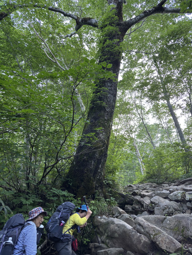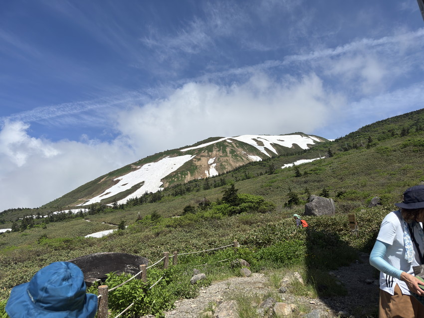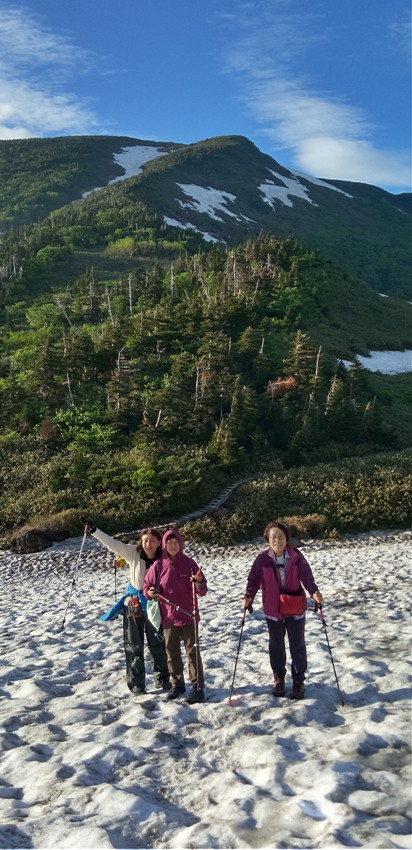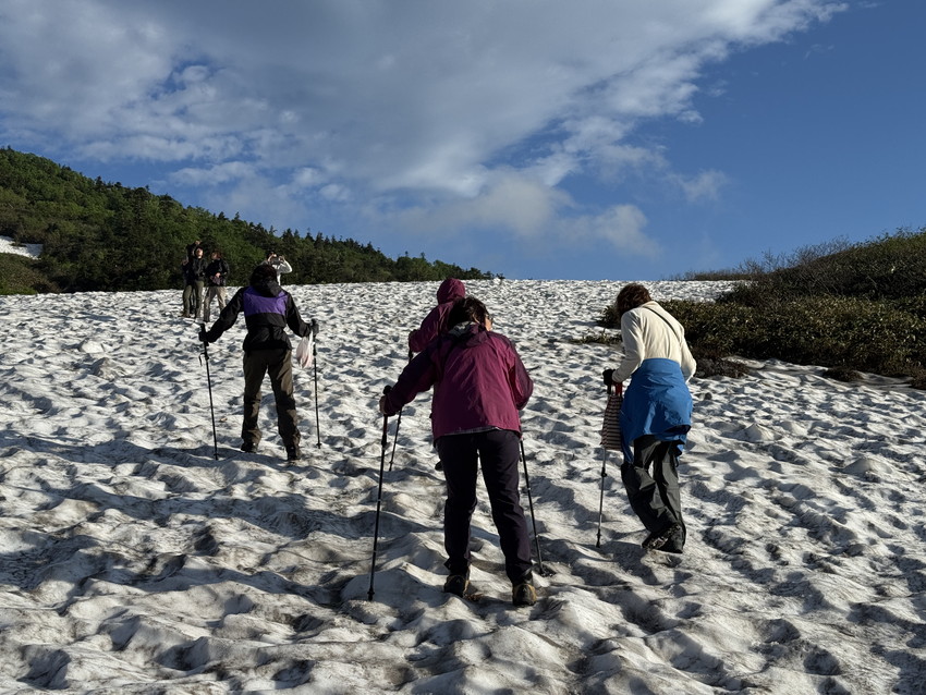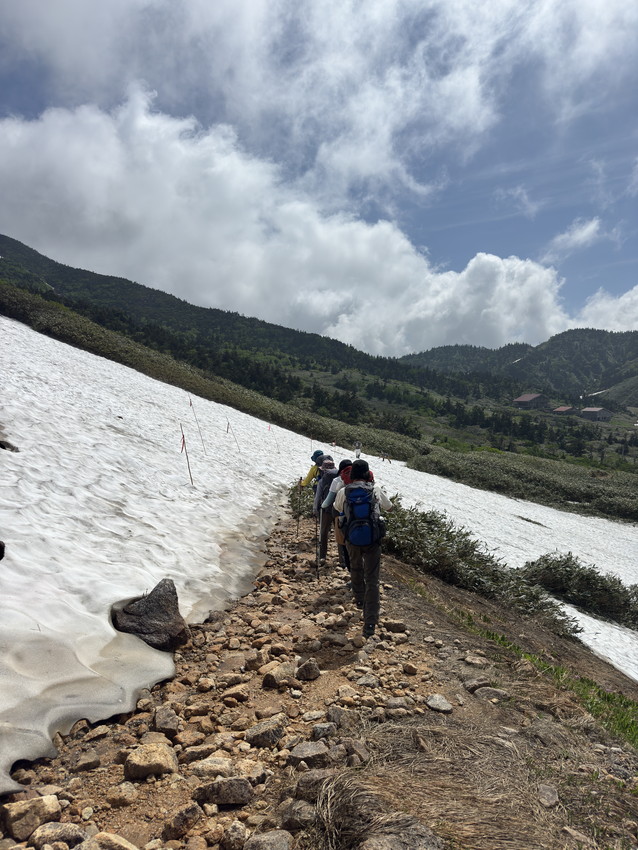 ・残雪が多いためコースを変更して砂防新道からのコースなりましたが見て納得。エコーラインやトンビ岩コースにはまだたくさんの雪が残っていました。登山道にはサンカヨウやキヌガサソウの群生やたくさんのお花が咲いていて、暑さと急登の中、癒されました。楽しい白山の山行でした。ありがとうございました。(AKIYO)