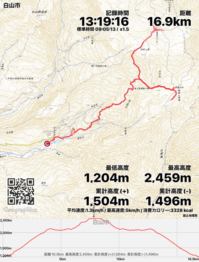 | 4日:JAいびがわ2:00⇒別当出合P5:25→甚之助避難小屋8:15→南竜山荘9:30~9:55→黒ボコ岩→室堂11:50~12:35→御前峰 11:30~11:40→黒ボコ岩→南竜山荘キャビン14:50(泊) 5日:南竜山荘キャビン5:40→黒ボコ岩→別当出合9:00⇒温泉⇒JAいびがわ14:40 |