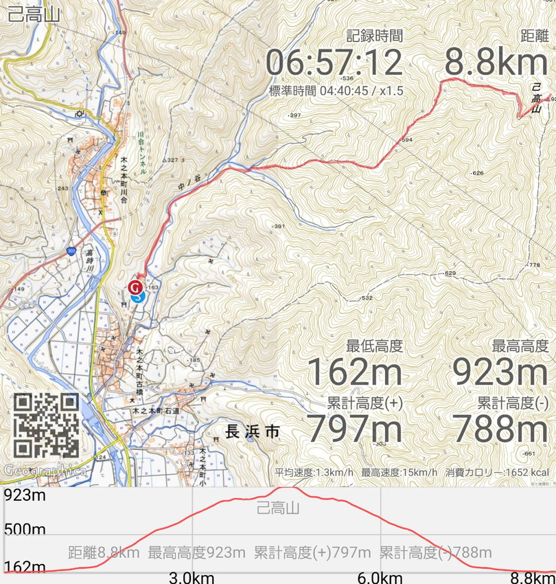 | 己高山登山駐車場7:00→仏供谷登山口7:30→鶏足寺跡手前9:40~10:30→鶏足寺跡10:35→己高山10:50~11:20→鶏足寺跡手前11:45→仏供谷登山口13:30→己高山登山駐車場14:00 |