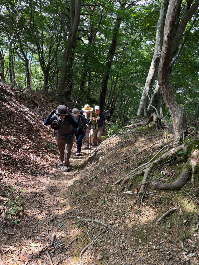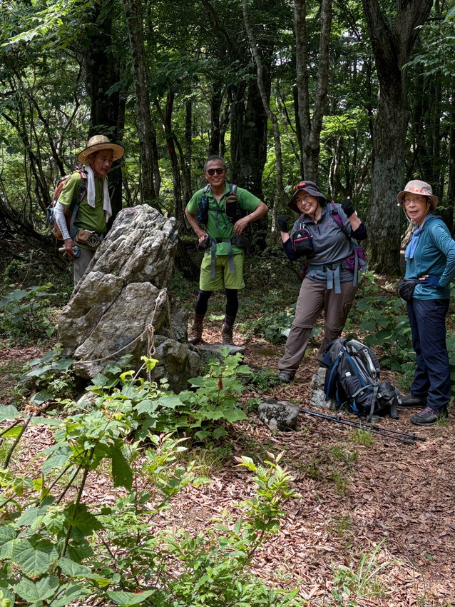 - 初めての己高山鮮やかな緑の中登りごたえのある素敵な信仰の山でした、暑さのため体調崩して登頂できなかった方がいたので紅葉の頃またご一緒したいです(nao)・鶏足寺跡手前9:40~10:30 後ろを気にしつつ立ち止まりながら進めていたが気が付くとTさんと男Tさんがまだのようでしばらく鶏足寺跡手前で待つ、その少し手前で動けない旨、男Tさんからライン連絡が入る、SLのKさんとnaoさん経口補水液、芍薬甘草湯、ロキソニン等をもって戻りマッサージ等試みるが快方せず、SLのKさんがTさんとその場で待機することに、他のメンバーで己高山に、周回はやめて来た道道をもどることにした。
