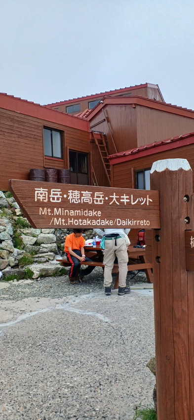 - 南岳小屋で大キレットを眺めながら、後ろ髪を曳かれる思いで、南沢ルートをひたすら下る、ガレ場・残雪・やせ尾根・腐り階段となかなか厳しい。何とか槍平小屋に到着した後の「うどん」は美味かった。