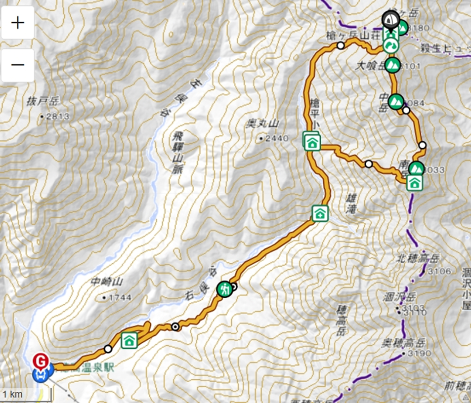 - 新穂高ロープウエイに向け、来た時と同様、単調な山道と林道を下り下山。