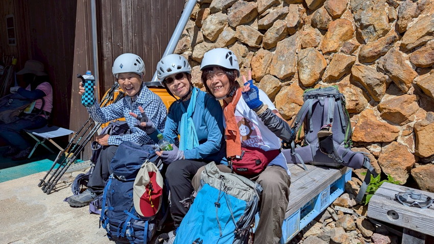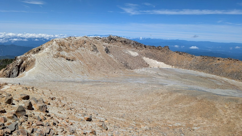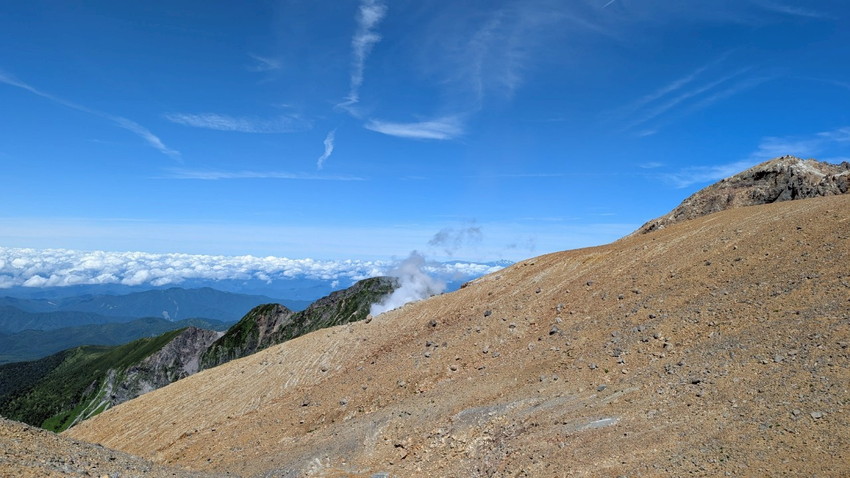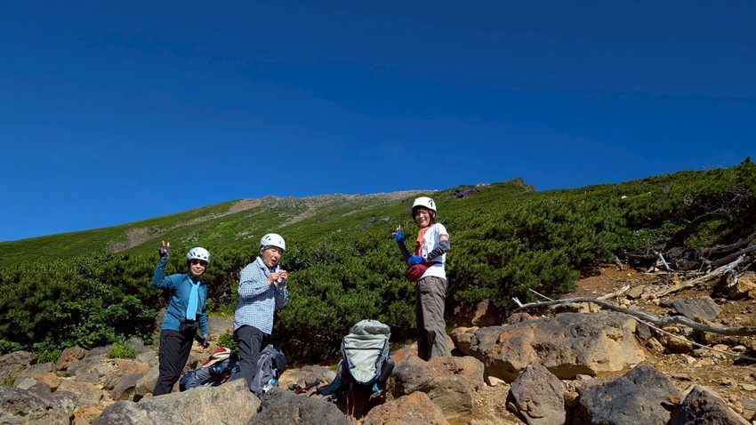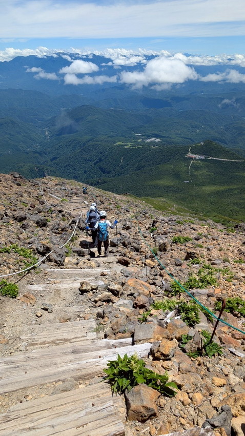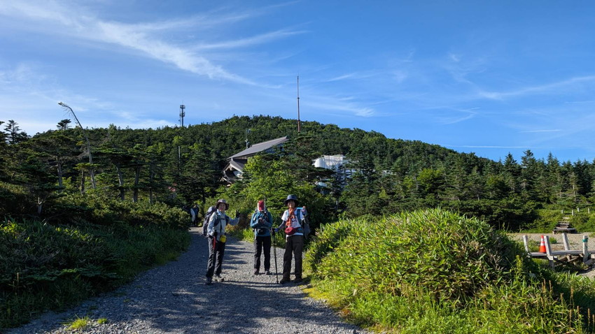 - 今日は天気に恵まれ、風が吹く涼しい登山道でした。八合目、九合目、山頂からの景色は富士山、甲斐駒、八ヶ岳、浅間山、北アルプス等の山々が望め、嬉しかったです。涼しいので、各所で休憩時間が長くなり、登り、下りともゆっくり過ごした山歩きでした。王滝頂上から硫黄の臭いや、高く上がるガスに活火山の怖さに身体がすくむ思いでした。、剣ヶ峰では亡くなられ方々の慰霊碑に、ご冥福をお祈りいたしました。