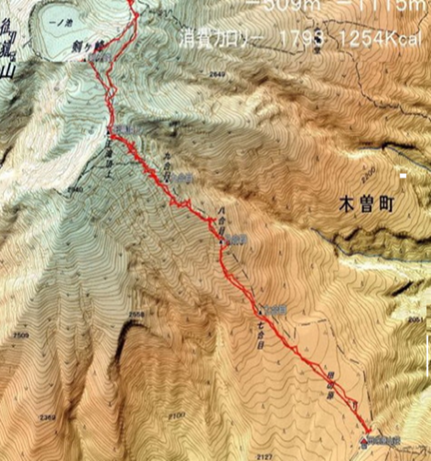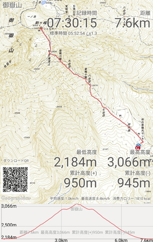 | 安八役場4:40→田ノ原7:14→御嶽神社遥拝所7:24→八合目避難小屋8:21~37→九合目避難小屋9:22~46→王滝頂上9:56~10:21→剣ヶ峰10:39~11:55→王滝頂上12:09~26→九合目12:35→八合目13:29→遥拝所14:19→田ノ原14:30→安八役場19:30 |