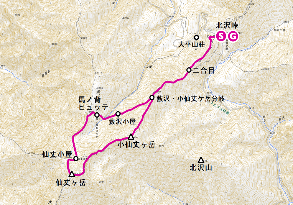 | 北沢峠6;40→馬の背ヒュッテ10;00→仙丈ケ岳11;30→休憩12;00→小仙丈ケ岳12;40→大滝頭13;30→北沢峠15;00→バス仙流荘前16;00 |