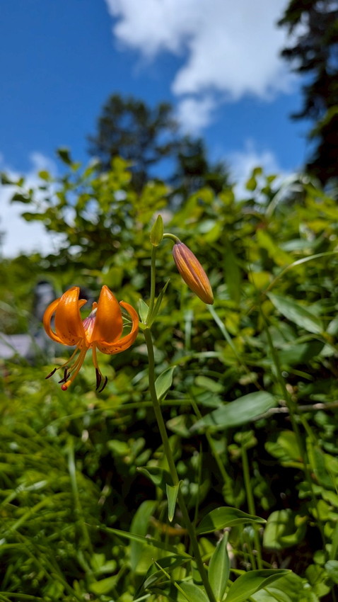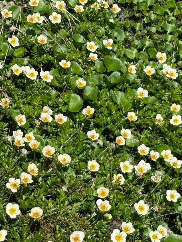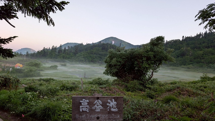 - 火打山は整備された木道が続き、木陰の中を歩くことができた。ただテント泊の荷物は重く体力を消耗した。泊地の水が煮沸しても飲料水の数値ではないとの事前情報から、共同のお水を各自1ℓ追加したのも影響。高谷池の泊地はわりと平らで、側に池塘があり雰囲気がよかった。天狗の庭の白いふわふわのワタスゲの群生には一同オォ~とみとれてしまうほど。他にもお花が咲いていて癒やされる。