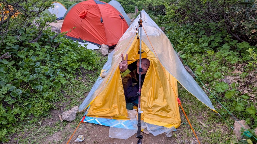 - 2日目は3時に起床しテント撤収。テントについた夜露を拭くもしっとり濡れたままザックへ。