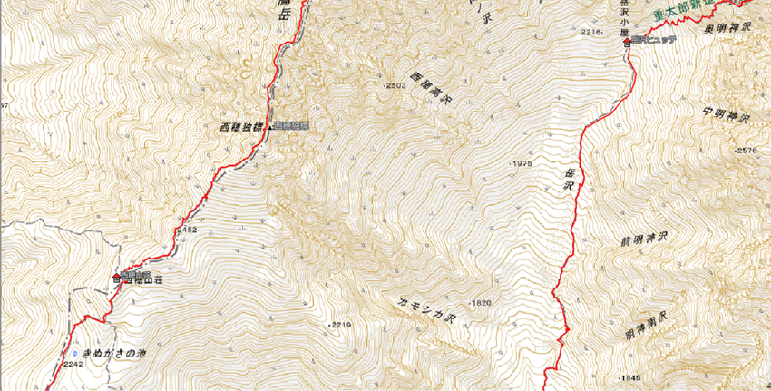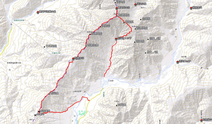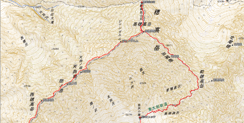 | ■1日目 上高地帝国ホテル 07:20 – 07:35 田代橋 – 07:39 西穂高岳登山口 – 07:50 上高地焼岳登山口 – 08:36 峠沢梯子場 – 10:01 長ハシゴ 10:12 – 10:34 新中尾峠 – 10:36 焼岳小屋 11:10 – 12:30 割谷山 12:50 – 13:20 中間の池 13:21 – 14:33 きぬがさの池 14:34 – 14:49 西穂高岳・焼岳分岐 14:56 – 15:09 西穂山荘 ■2日目 西穂山荘 05:05 – 05:25 西穂丸山 – 06:39 西穂独標 06:40 – 07:33 ピラミッドピーク 07:34 – 07:55 チャンピオンピーク4峰 – 09:07 西穂高岳 09:18 – 09:26 P1 09:38 – 10:22 赤岩岳 – 11:32 間ノ岳 11:35 – 12:06 間天のコル – 12:21 逆層スラブ – 12:58 天狗岩 13:05 – 13:39 天狗のコル 13:48 – 14:48 畳岩尾根ノ頭 14:51 – 15:43 コブ尾根ノ頭 15:57 – 16:06 ジャンダルム 16:10 – 16:20 ロバの耳 – 18:06 穂高岳 18:12 – 18:50 穂高岳山荘 ■3日目 穂高岳山荘 05:46 – 06:41 穂高岳 06:42 – 07:01 南稜の頭 07:17 – 09:03 紀美子平 09:19 – 09:27 雷鳥広場 09:33 – 10:00 岳沢パノラマ 10:22 – 10:38 カモシカの立場 10:52 – 11:46 岳沢小屋 14:10 – 15:45 見晴台 15:46 – 15:56 岳沢風穴 16:00 – 16:46 岳沢湿原・岳沢登山口 |
