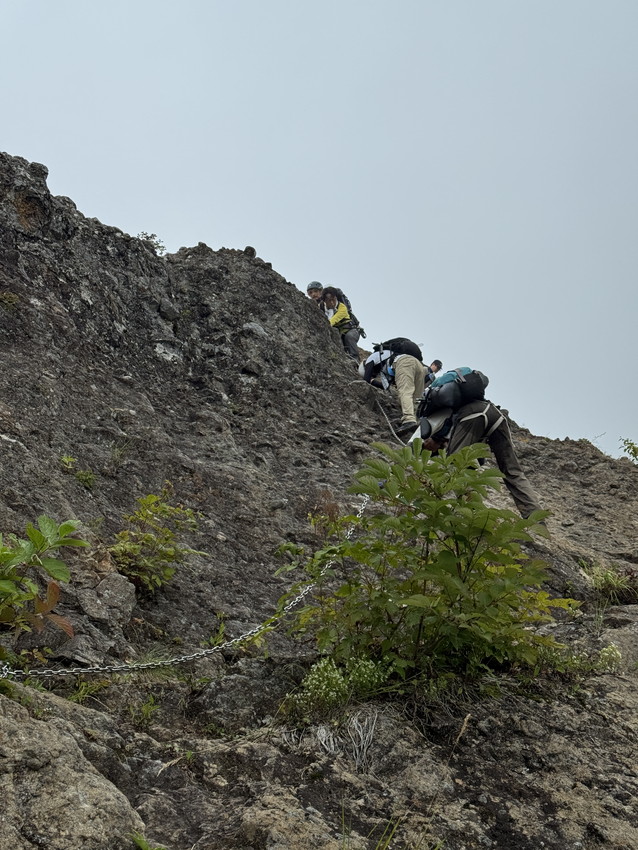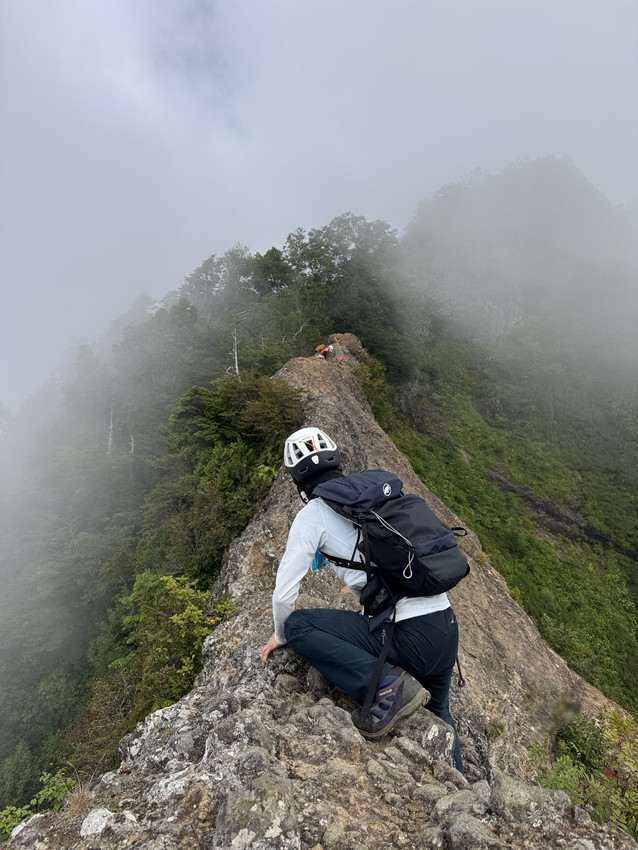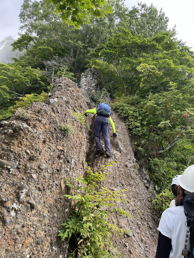 - 暑さと急登と岩登りで足が攣ってしまい、芍薬甘草湯(68)とマグネシウムを松久さんにもらってなんとか乗り切りました。岩場では手がかり、足がかりがはっきりしていて、靴底すべることなく、しっかり足が乗るので安心できた。蟻の塔渡りも無事クリアーし、少し度胸がついた気がします。(SONOKO)