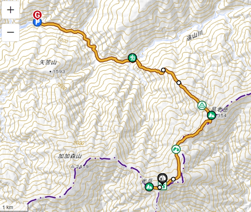 | 1日目:芝沢ゲート5:20~易老渡6:45~易老岳12:30~光小屋16:02 2日目:光小屋6:00~光岳6:30~光石6:45~光小屋7:30~易老岳10:20~易老渡14:45~芝沢ゲート16:02 |