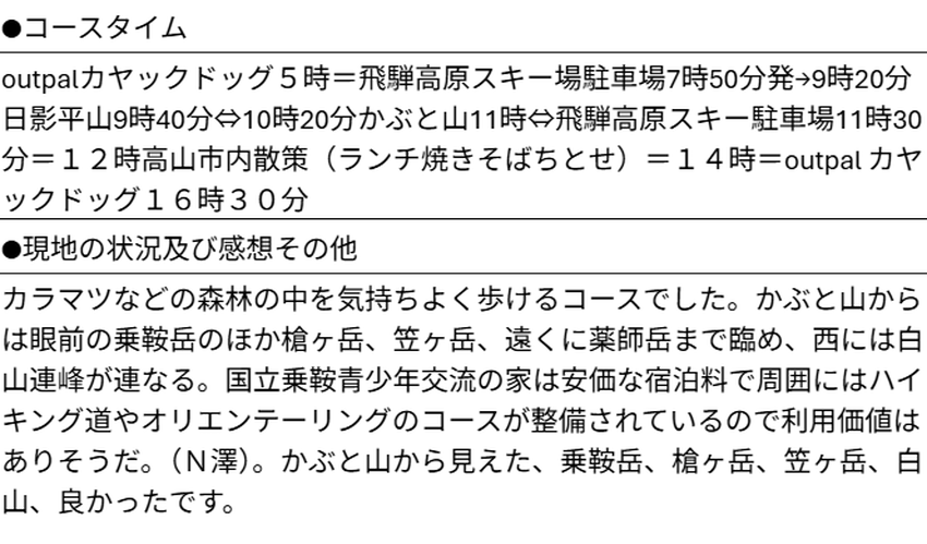 2025年9月6日 / 最終更新日時 : 2025年9月14日 管理者01 山行記録 日影平山・かぶと山(飛騨乗鞍高原) 2025年9月6日 記録 メンバー ドライバーケン、K澤、長S、K村、O井、マサマサ コースタイム及び現地の状況及び感想その他 写真 FacebookXBlueskyCopy