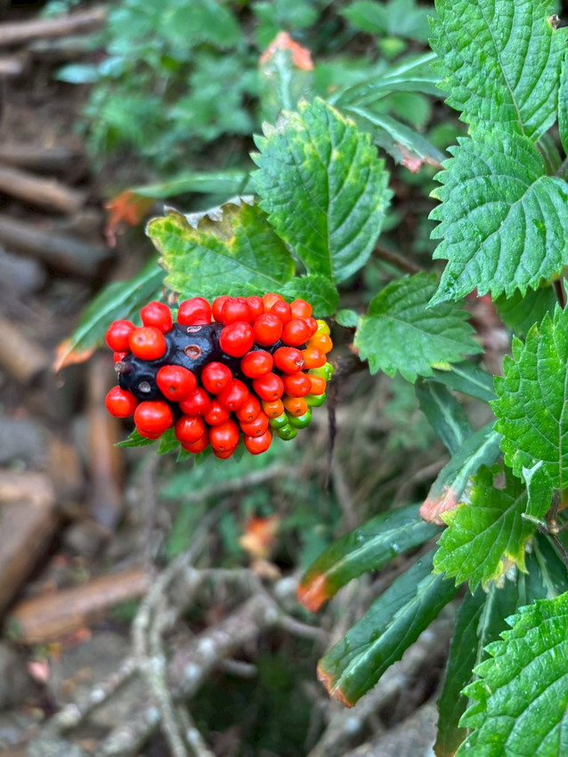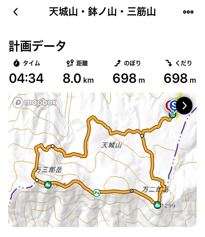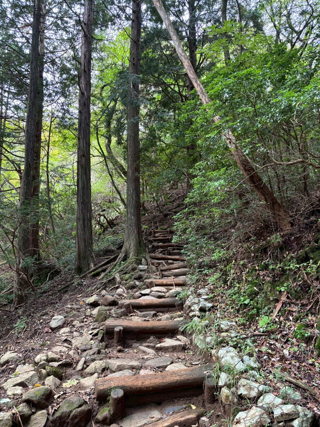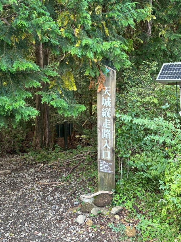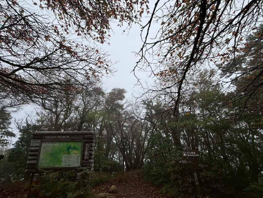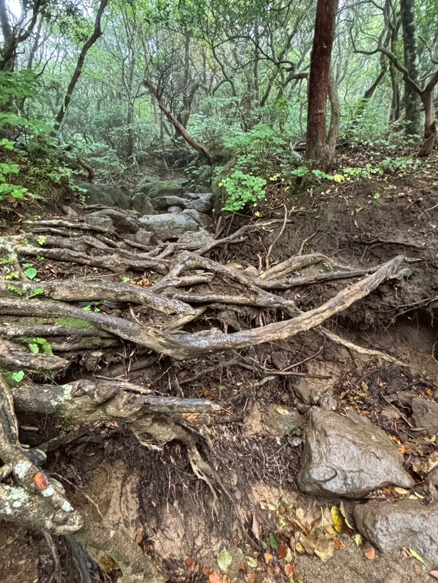 - 天城山縦走登山口時点で、すでに曇り空。準備運動をしてスタートする。しばらく綺麗に整備された道が続く。徐々に荒れた道も増え、小雨も降る。転倒しないように注意深く歩いていく。万二次郎まで後1㎞の辺りから急登になる。緩んだ所で万二郎岳に到着。小休憩を取り、万三郎岳を目指す。