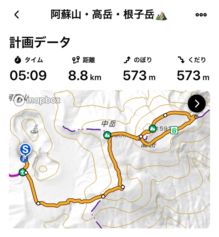 | 自宅5:30→小牧空港7:10→熊本空港8:40→阿蘇山火口避難休憩所駐車場10:50→古坊中登山口11:00→中岳13:30→高岳13:50→中岳14:40→古坊中登山口16:10→阿蘇山火口避難休憩所駐車場16:20→宿(泊) |