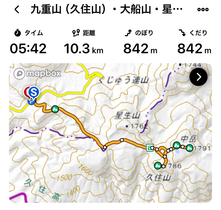 | 牧ノ戸峠登山口6:50→中岳9:40→久住山10:40→九住分かれ11:40→牧ノ戸峠登山口13:30→宿(泊) |