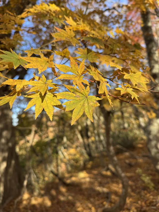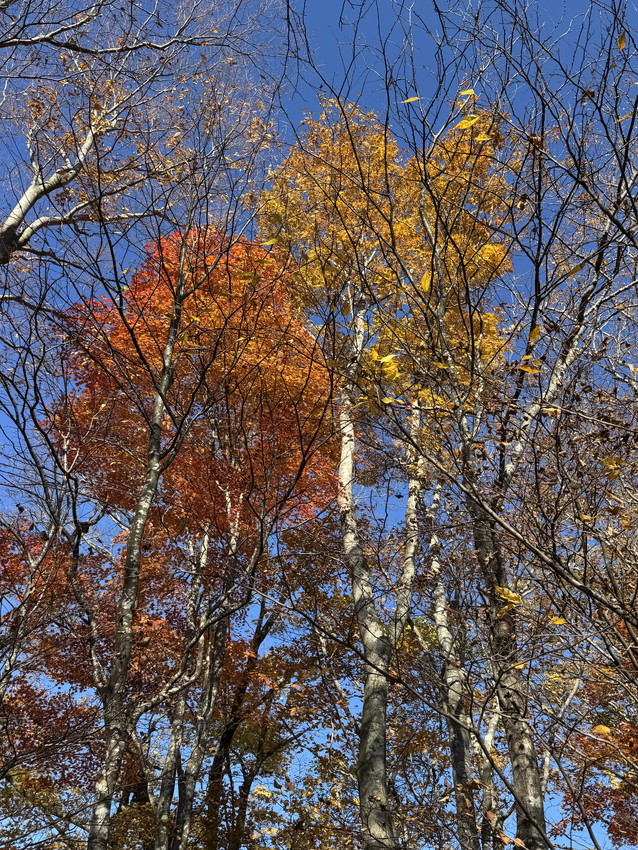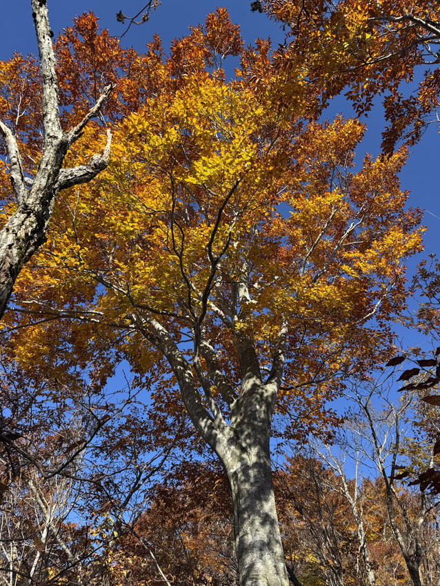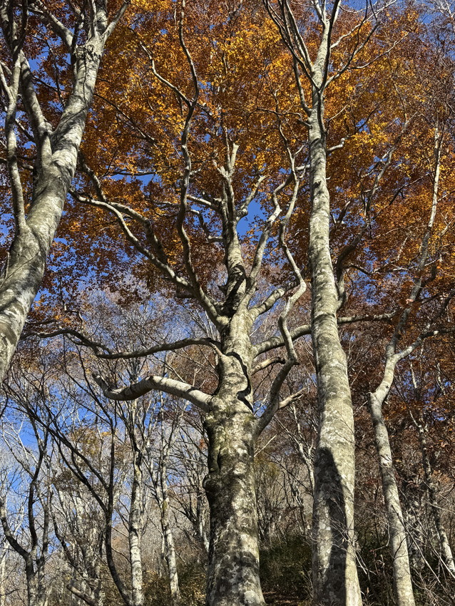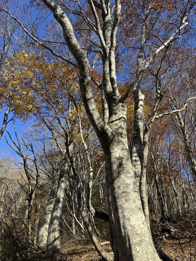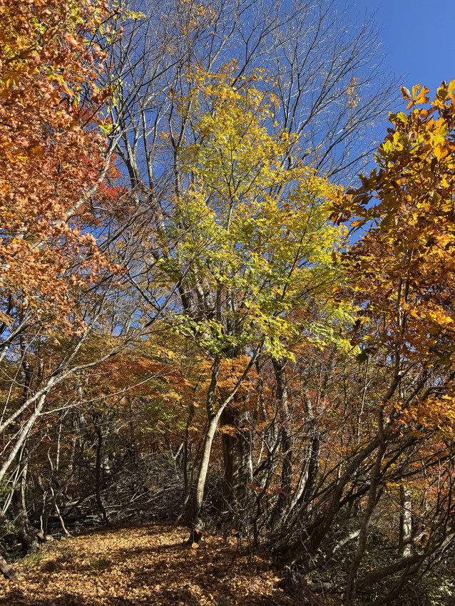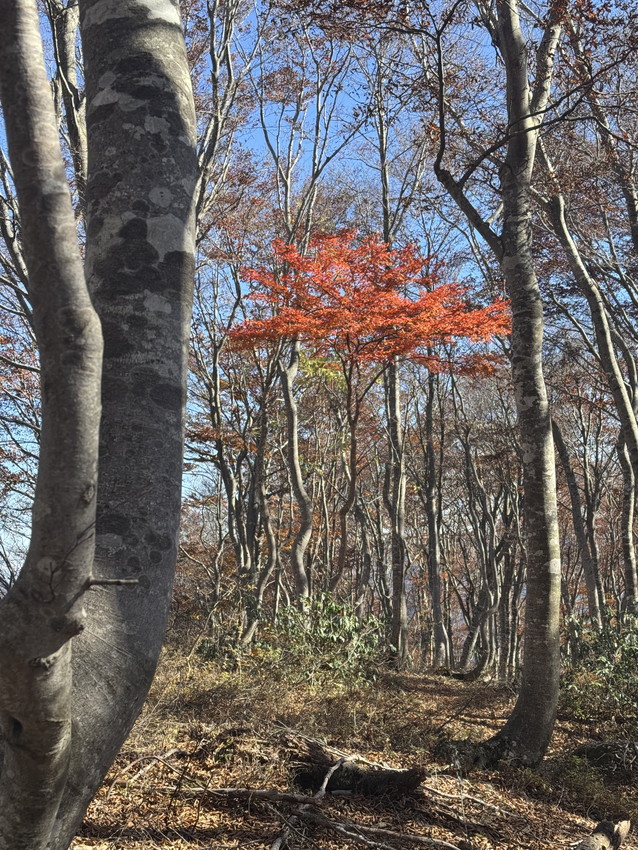 - 途中、石も木にも、手足の置き場のない急登で、落ち葉だけを踏みしめて登る経験は初めてで、体力が要りました。しかし、素晴らしい紅葉とてっぺんの広さと景観。そして快適な尾根歩き。もちろん熊避けの会話は途切れることはありませんでした。