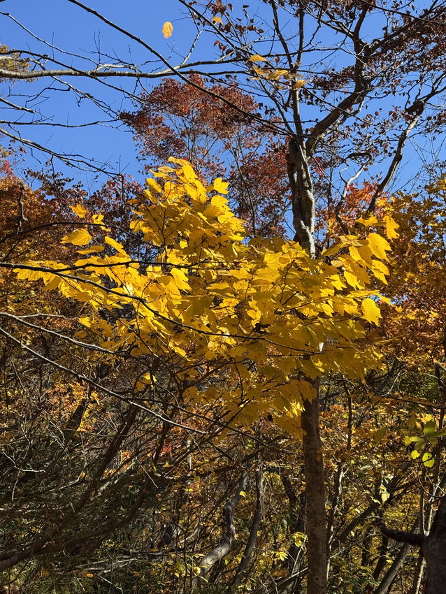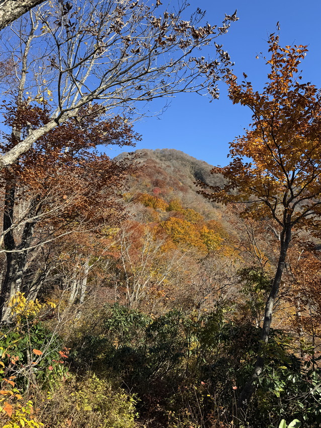 - 秋晴れの中、急坂を汗を拭うほど暑さでした。途中、左下から聞こえた犬?の泣き声にえっと驚き、犬連れて登ってる人がいるかと思ったら、山頂で他の登山者に、あれは熊の泣き声だと聞きビックリしました。ラジオかと思う程のお喋りが、ずっと続いてつくづく良かったと思いました。久々の1000m越えの山の紅葉は素晴らしく、目に焼き付けて歩けました。充実した山行に感謝します。