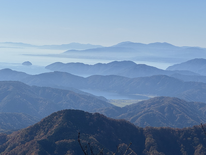 - 天気は快晴、風もなく適温の絶好の山登り日和でした。山々は赤、黄、緑に染まり、それぞれの色のグラデーションが、太陽に照らされて美しく輝いていました。長い尾根歩きは快適で眺望も良く、紅葉の他に琵琶湖に浮かんだ竹生島や雪を被った白山までもくっきり見えました。心がけが良かったのか、最高の紅葉山行となりました。