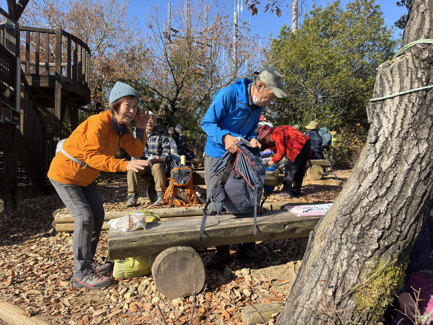 - 長良川ふれあいの森Pは出発時点で多くの車でほぼいっぱいの状態です。Pにトイレは無いので少し手前の温泉の横で利用できます。登山道は広くて歩きやすいですが、この時期、落ち葉で石ころが見えないので用注意です。最後の山頂への登りの所で美濃ハイクの方達にお会いしました。40名程で登られているとかで、山頂でも残って見えるパーティーがありT橋さんがお話されていました。風が無いので陽当りはポカポカ、遠くはぼんやりと霞んでおりました。下山は周回で西峰を踏んで、巡視路を下り自然歩道に出ました。低山は登山道がいくつも通っていてかえって難しいですね。無事朝の駐車場に戻って帰路に着きました。日頃、会の行事に参加しておらず、現在の状況を把握していないので色々話が聞けて、有意義な山歩きとなりました。T橋ご夫妻、ありがとうございました。(山N)