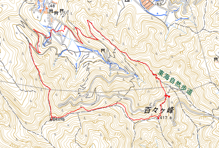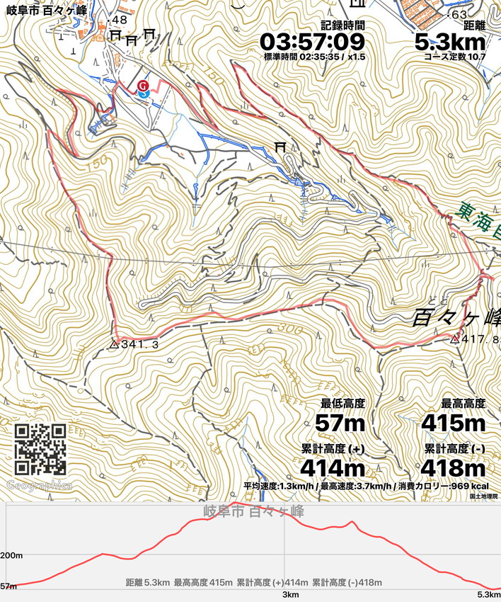 | 長良川ふれあいの森P9:30→山頂手前トイレ→百々ヶ峰11:15~11:50→西峰→自然歩道出合→長良川ふれあいの森P13:10 |