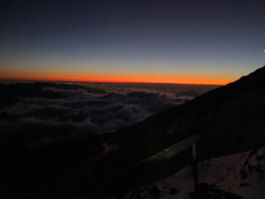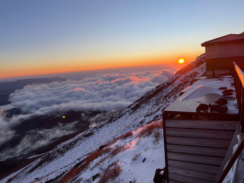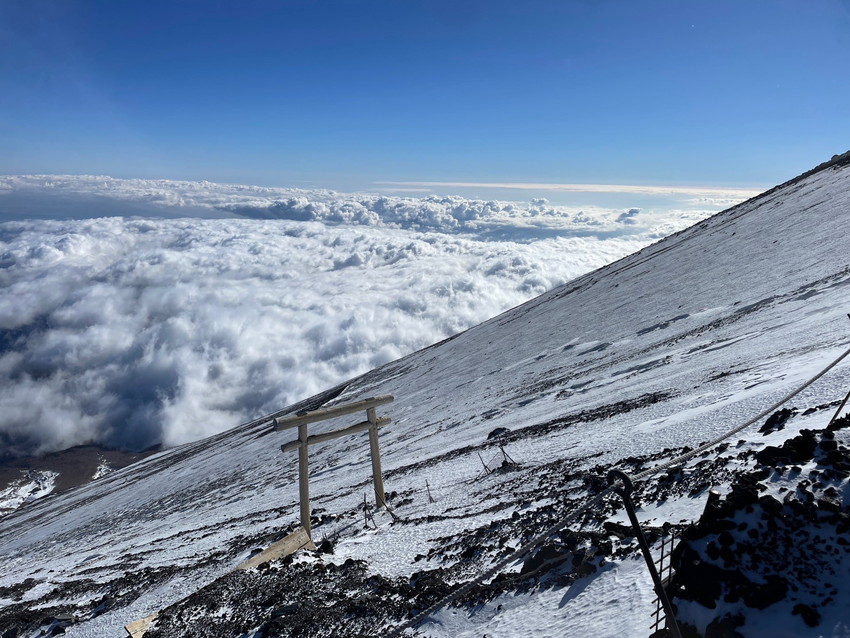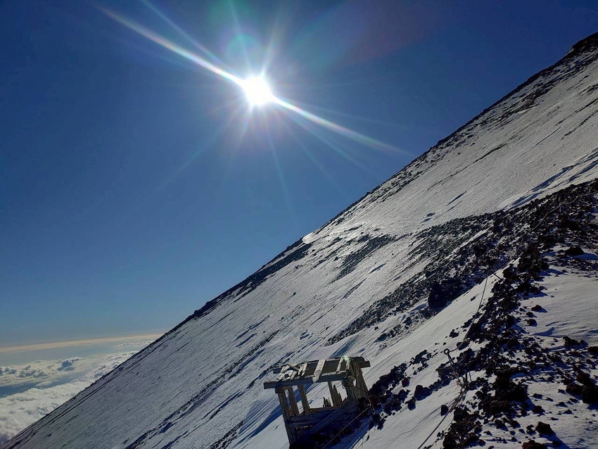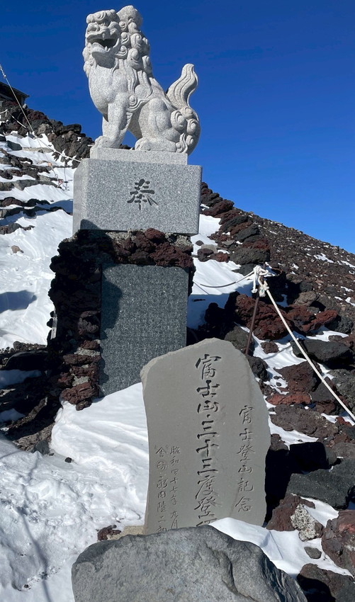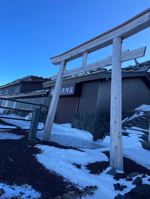 - 2日目:晴。午前4時20分出発。気温−13°。チェーンスパイク&ストック。7合目でアイゼン&ピッケル。防寒対策するも身体が温まるまでは寒い。最後の小屋から山岳ガイドとロープで繋ぎ安全確保。山頂までは突風で身体が持って行かれそうになりながらも山頂目指す。傾斜もキツく足の運びには細心の注意を払う。直下の滑落が多発する箇所はアイゼンの刃が刺さるのを一歩一歩確認しながら歩いた。剣ヶ峰は風も強く断念。山頂 気温−16°。風速20m/s。下りは上り以上に気を遣いながら慎重におりた。佐藤小屋に15時到着。