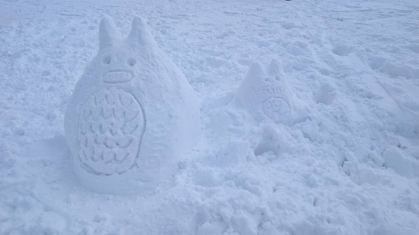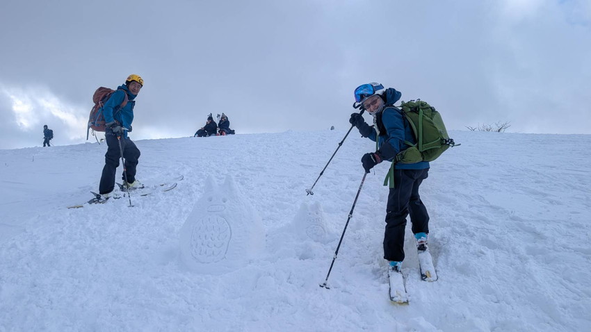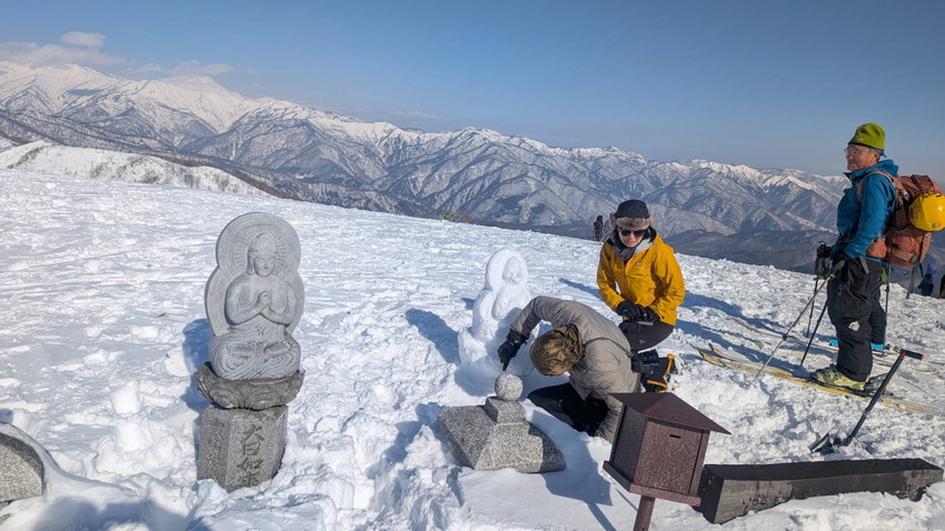 - 大日ヶ岳山頂には20名くらいの人で賑わっていて、大日如来像を雪で作成している女性がいました。他にもトトロの親子や馬の雪像もあって楽しめました。また、着ぐるみを来た人、赤ちゃんを背負っていたお母さん、親子連れのスキーヤ―、弱層テストをしていた人などバラエティーに富んでいました。