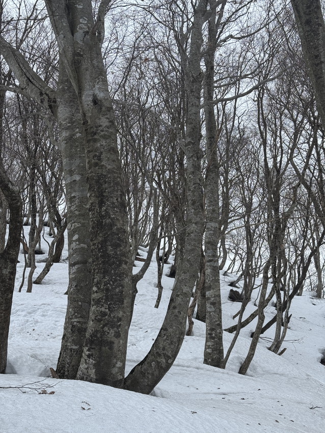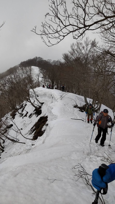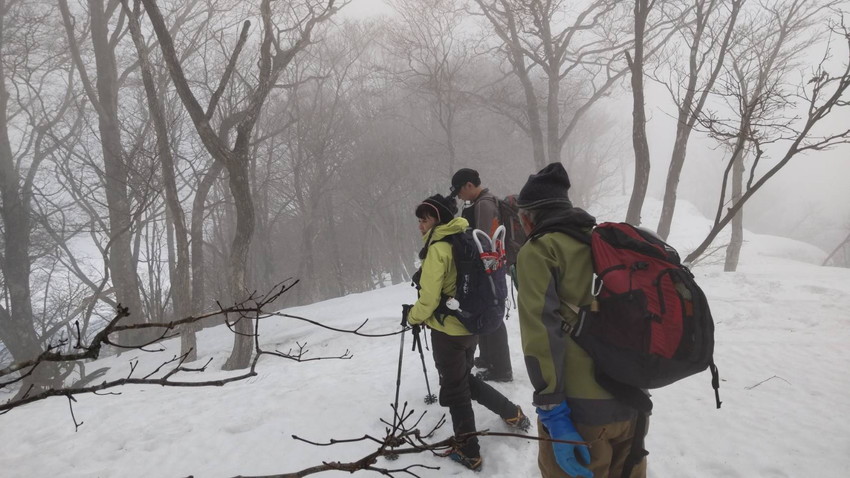 - 冬の小津権現山はまだ登頂していないし、藤橋道の駅からの冬季ルートが「白薔薇」人気でトレースがあるので、距離はあるけどなんとか登れそう、ということで計画してみた。雪は770辺りからだったが、雪は締まっていてツボ足でも充分歩けた。緩やかではあるが何回もアップダウンを繰り返し登頂。山頂ではガスで白薔薇も拝めず残念だったが、下山時はよく晴れて周りの山々がよく見えた。初めて登る尾根からの景色は方向感覚がいつもと違い、これもまたいいなと思った。山頂付近の雰囲気もよくまた来たいなと思える良いコースだった。(T橋♀)