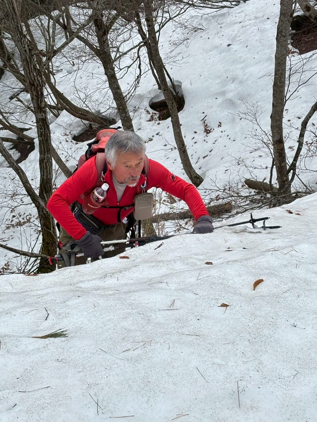 - 初めての周回、朝から楽しみにしてました。下山道は雪が多く、快適だったけど、そこが林道という、まさにその時、雪解けで滑りやすい木の横を上手く降りれず、ズルズルズルっと大声をあげ、回転して、落ちていきました。気持ち良かった!なんて事は絶体ないです。不覚!(ヒロミッチー)