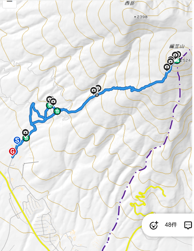 | 富士見高原登山口7:30~編笠山入口8:20~臼久保岩小屋~12:35編笠山14:05~臼久保岩小屋15:55~編笠山入口16:25~富士見高原登山者駐車場17:10 |