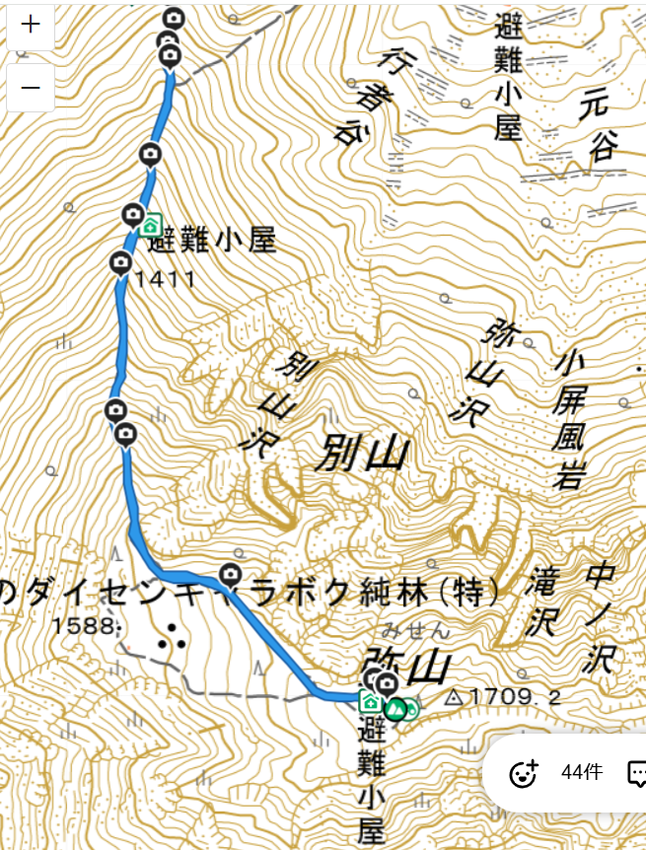 | 南光河原駐車場6:00~六合目避難小屋8:00~大山(弥山)8:50~頂上避難小屋(休息)9:00~六合目避難小屋10:20~南光河原駐車場11:10 |